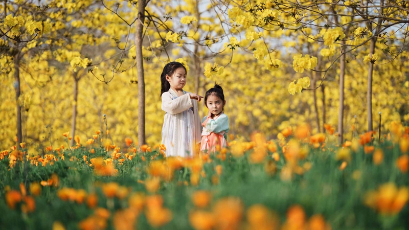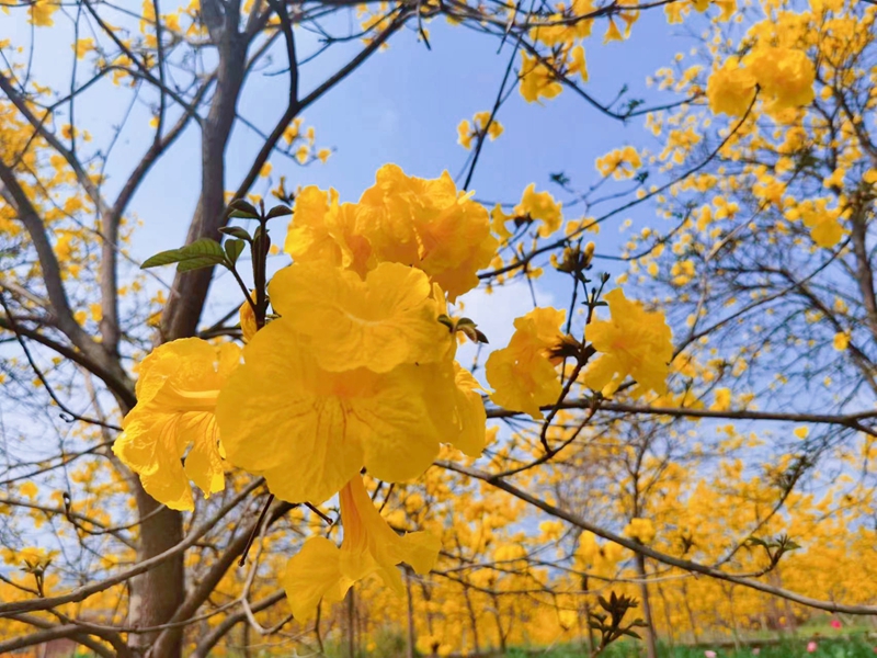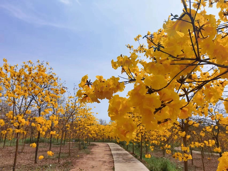 最近,位于四川省成都市金堂县赵家镇的3万余株黄花风铃木迎来盛花期。