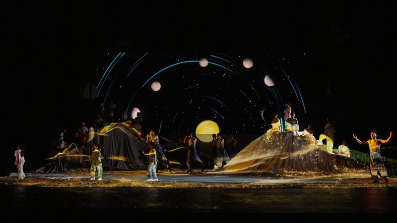 “我们想让这首歌回到千百年前,回到山河湖海、星辰宇宙中的求索与叩问。”本次《玉盘》的舞美设计紧扣“从地向天、由外而内”的情感线索。第一段主歌以地球场景为主,通过投影呈现屋檐、山川、湖海等自然意象;从间奏起,舞台转向星空,孩子们仿佛徜徉于银河,在回望地球的画面中完成对自我内心的叩问。服装方面,彝族元素与现代剪裁相结合,汉族儿童服饰则采用彩色泼墨的设计,传递写意与自然之美。整个舞台力图在简约中见深意,在写实中藏诗意,构建出一幅跨越时空的“问月图卷”。